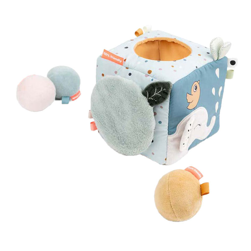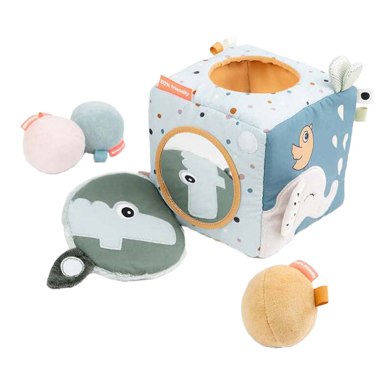 Bladeren die knisperen, een zachte babyspiegel en Croco die zich achter de deur verstopt zijn slechts enkele van de coole functies van deze kubus. Verstop je eigen schatten in de kubus of gebruik de drie knijpbare rammelballen in schattige kleuren die zijn inbegrepen.