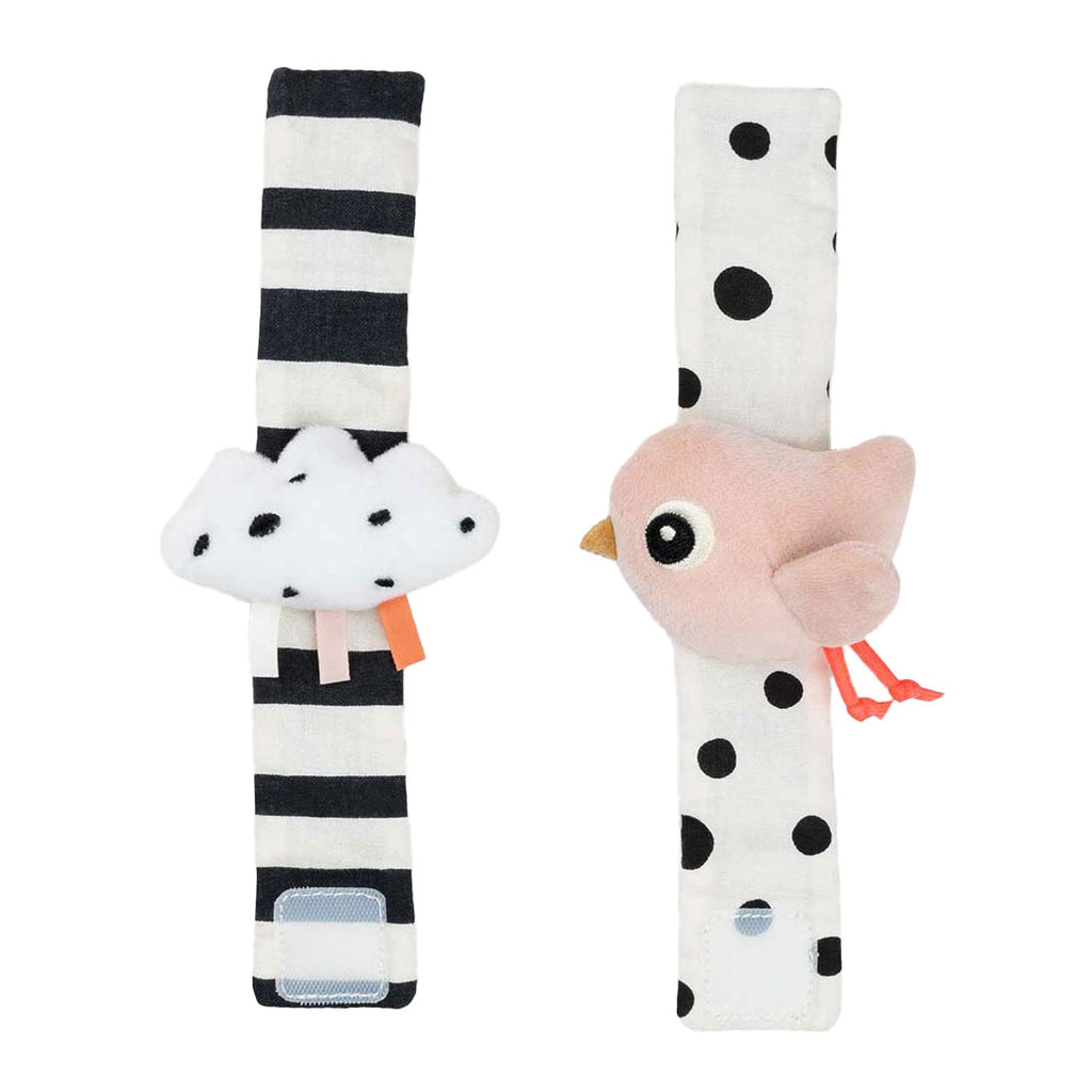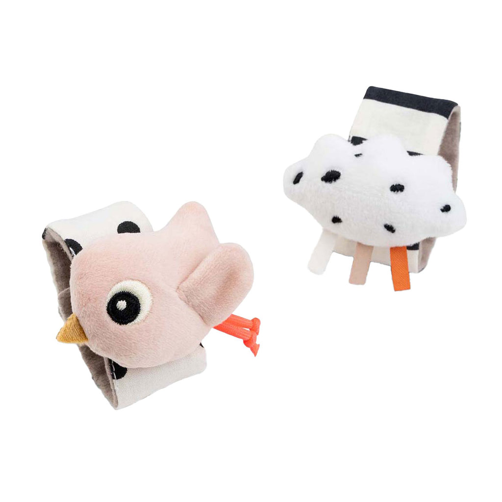 De ene armband heeft stippen en Birdee, de andere heeft strepen en een wolk. Deze rammelaars sluiten met klittenband om ze gemakkelijk te kunnen dragen en verwijderen en zijn geschikt voor zowel polsen als enkels. Verhoog de zintuiglijke ervaring van je baby met dit speelse en verstelbare accessoire, gemaakt voor ontwikkelingsactiviteiten.