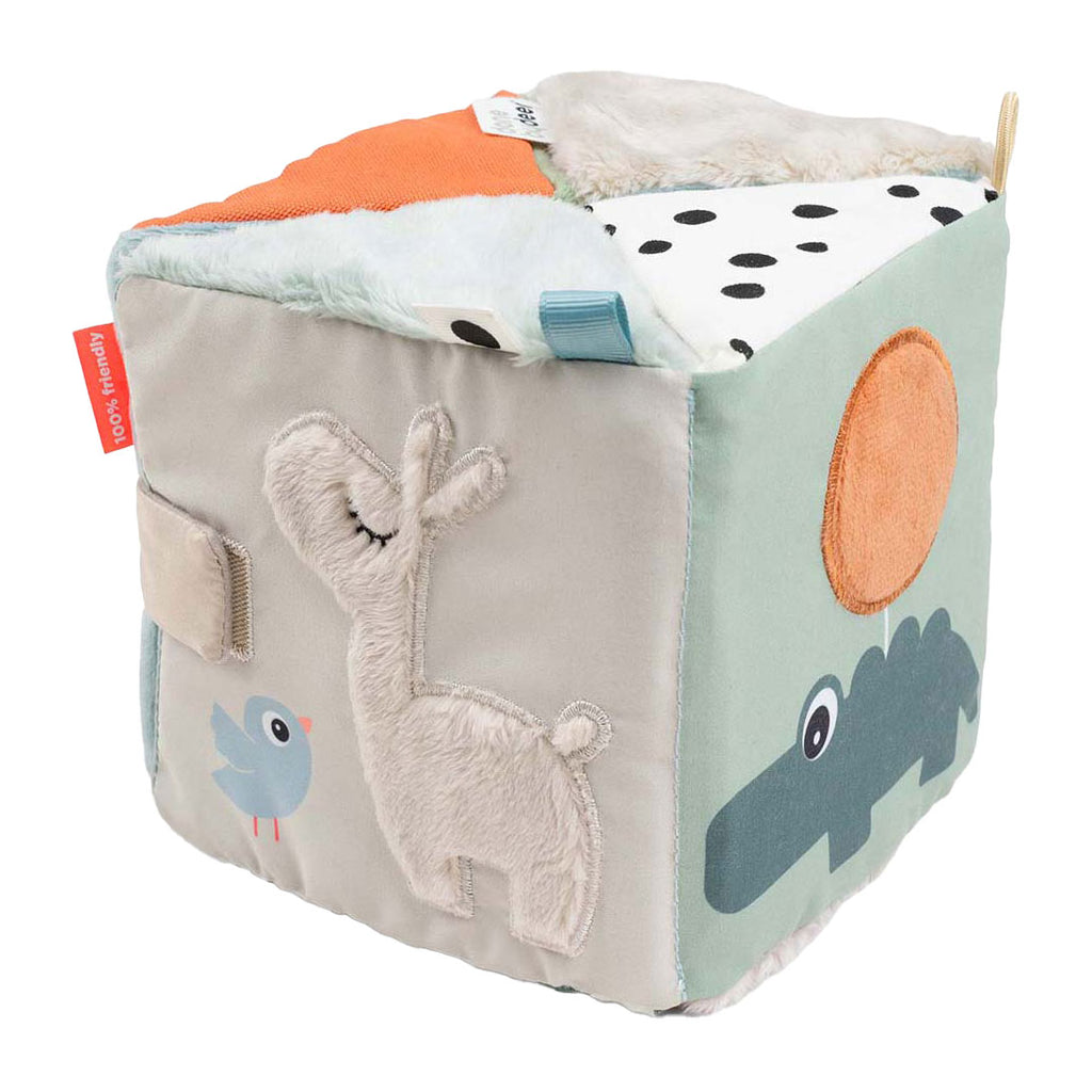 Het uitvouwbare sensorische boek kan worden gebruikt voor buikligging, kruipoefeningen of zittend spelen. Gebruik de klittenbandsluiting om de kubus te sluiten en er een motiverende dobbelsteen van te maken. Met een elastische lus voor eenvoudige bevestiging aan een kinderwagen of activiteitengym met behulp van een speelgoedkoppeling, combineert deze kubus entertainment en ontwikkelingsvoordelen voor de verkenning en groei van uw baby.
