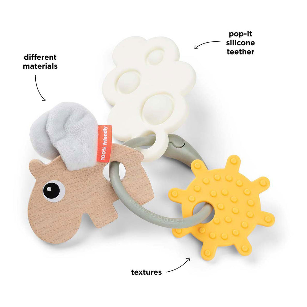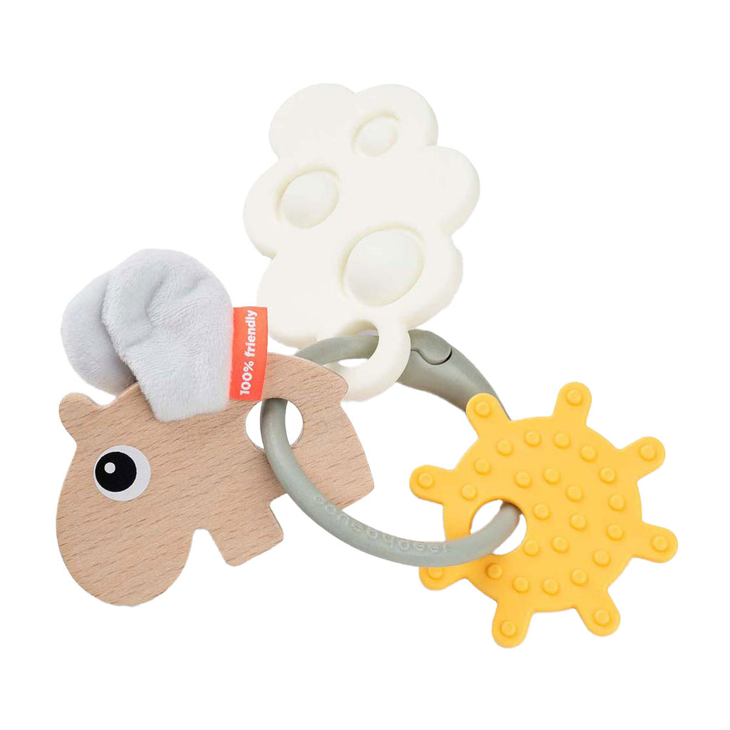 • Inclusief een houten Ozzo met textielvleugels, een siliconen bijtringwolk met 'pop', een plastic textuurzon en ring
