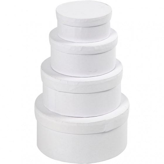 Ronde dozen van wit karton in 4 maten. Set van 4 stuks. In de maten 4 x Ø 8 cm, 5 x Ø 10 cm, 6 x Ø 12 cm en 7 x Ø 14 cm.