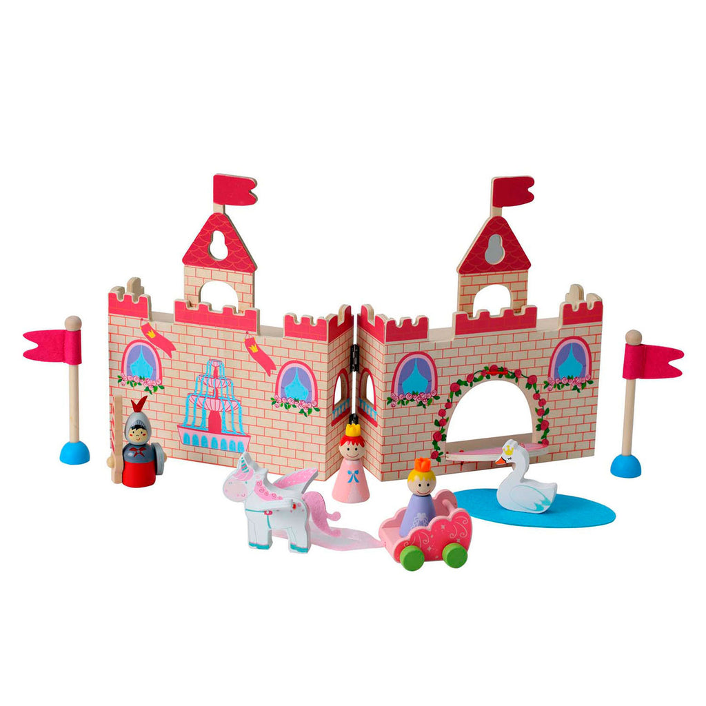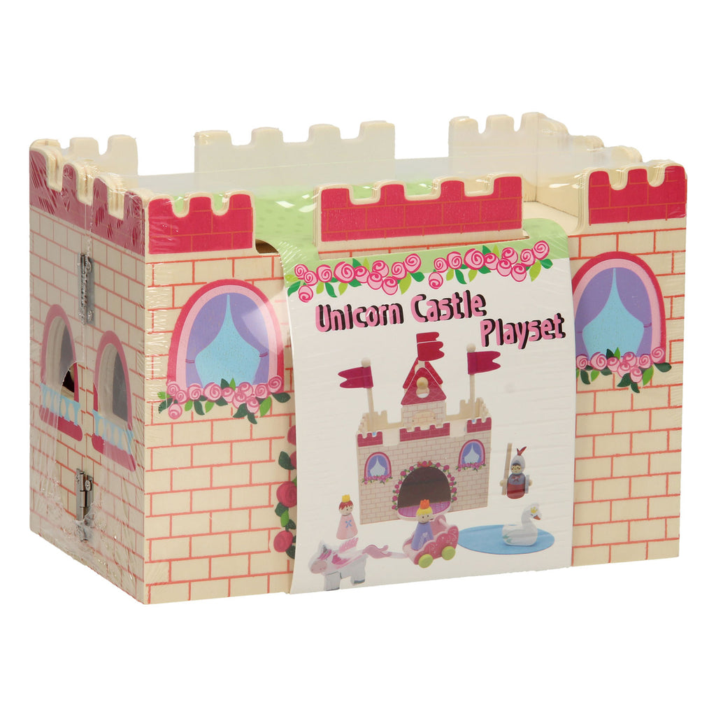 Ridderkasteel met speelfiguren. Het ridderkasteel kun je inklappen en handig meenemen. Inhoud: ridderkasteel, 2 vlaggenmasten, 1 ridder, 2 prinsesjes, 1 zwaan en 1 eenhoorn en koets bij de set.