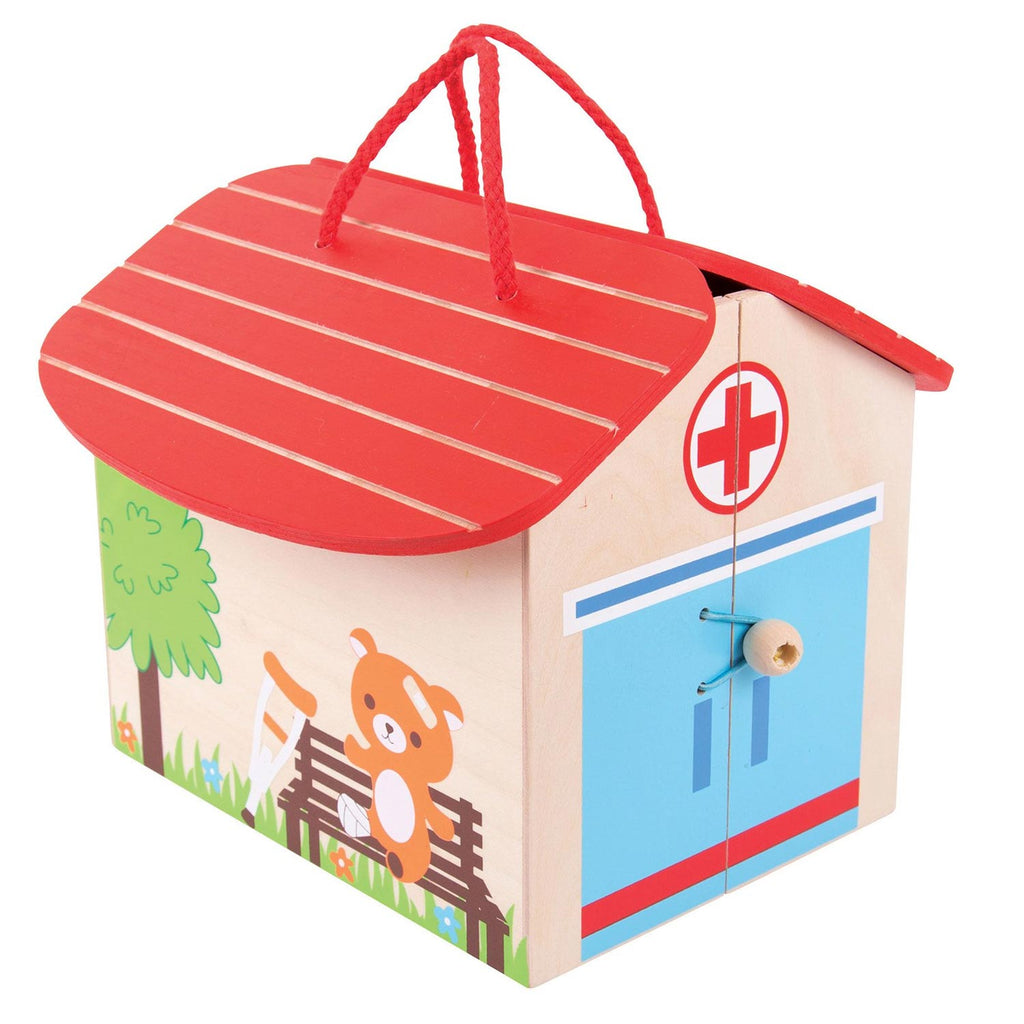 Open het Draagbaar Ziekenhuis en wees welkom in de wereld van dokters, zusters en patiënten. De set is makkelijk mee te nemen en op te bergen in het te openen en te sluiten ziekenhuis. Behandel de patiënt beer of voer de gegevens in de computer in. De 11-delige set is gemaakt van kwaliteitshout en bevat een ziekenhuis, 1 dokter, 1 zuster, 1 patiënt beer, 1 matras, 1 sprei, 1 infuus, 1 dokterstas, 1 hart controle machine en 1 tafel.