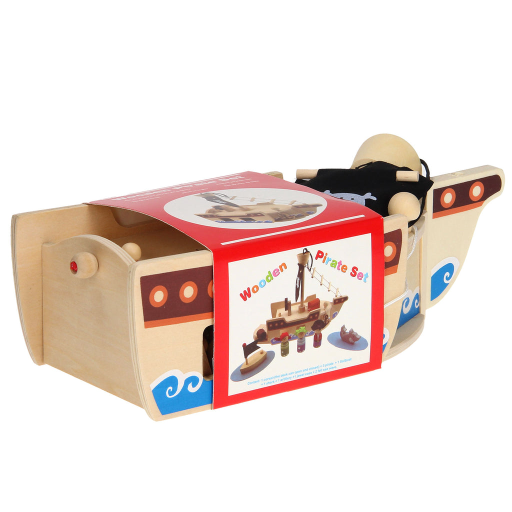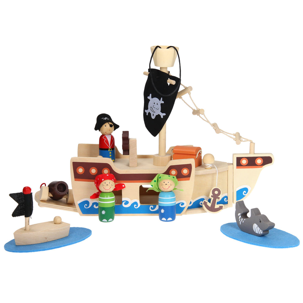 Neem jouw stoere Draagbare Piratenschip Speelset overal met je mee. Hij is stevig en gemaakt van hoogwaardige kleurrijke materialen en eenvoudig in elkaar te zetten en uit elkaar te halen. Met 3 piraten, haai, zeilboot, kanon, roer, schatkist en vlaggenmast met ladder.