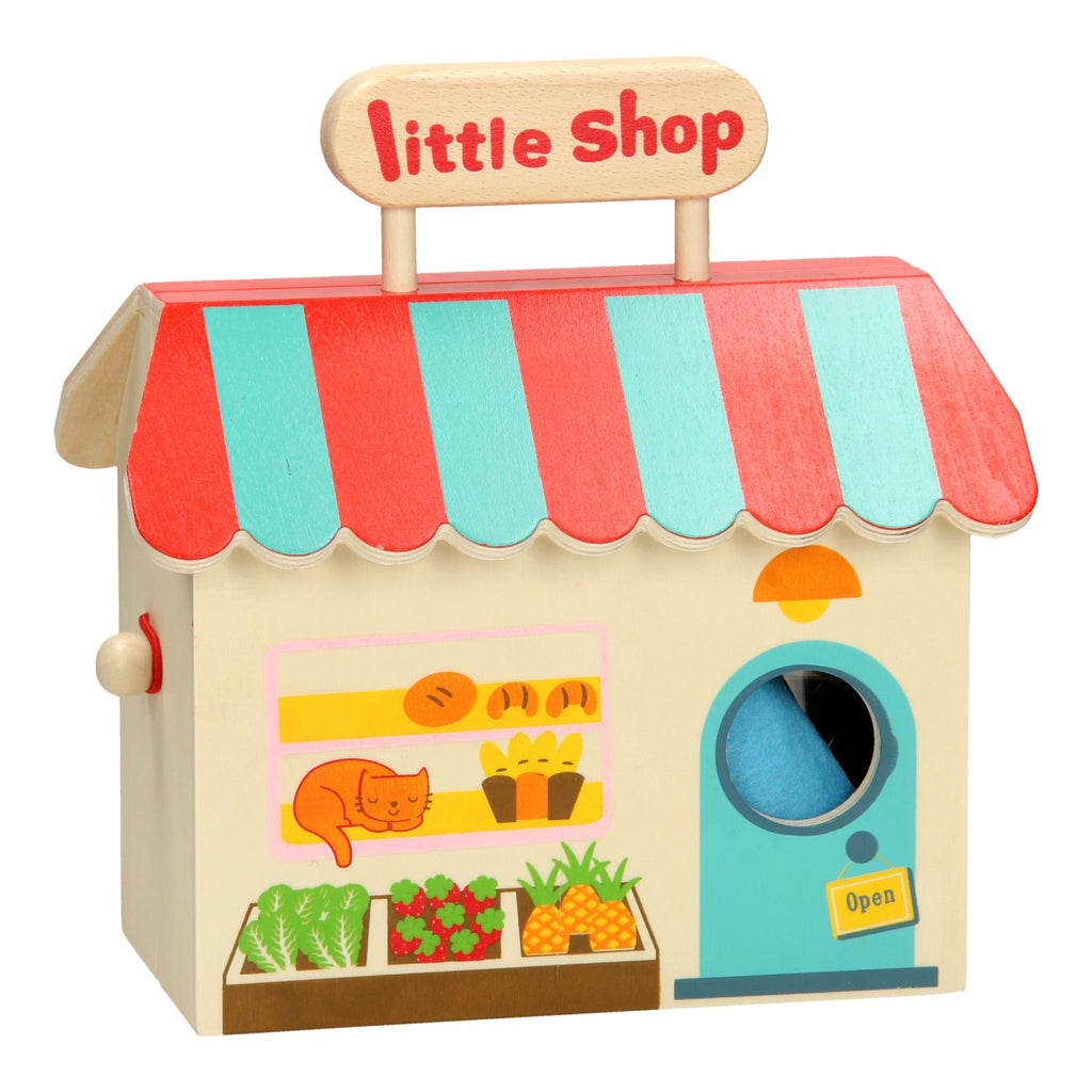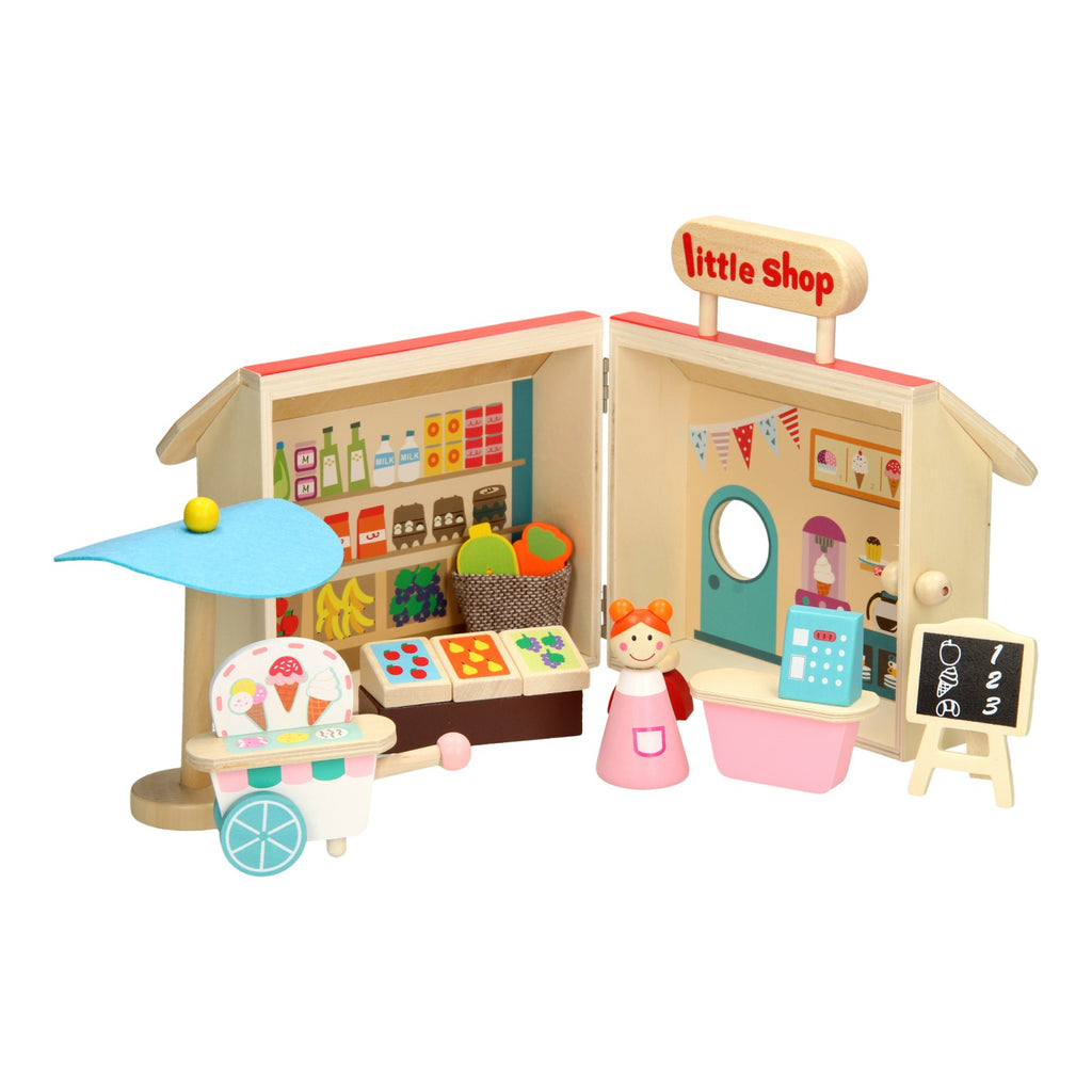 Appels te koop! Verkoop fruit en ijsjes met de houten Draagbare Supermarkt Speelset! De set bestaat uit een houten supermarkt, toonbank met kassa en weegschaal, fruitkraampje, mand met fruit, parasol, ijscokar, krijtbord en speelfiguur. De houten Draagbare Supermarkt Speelset is niet alleen leuk om mee te spelen, hij ziet er ook onwijs mooi uit!
