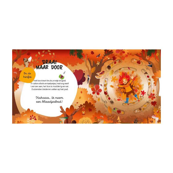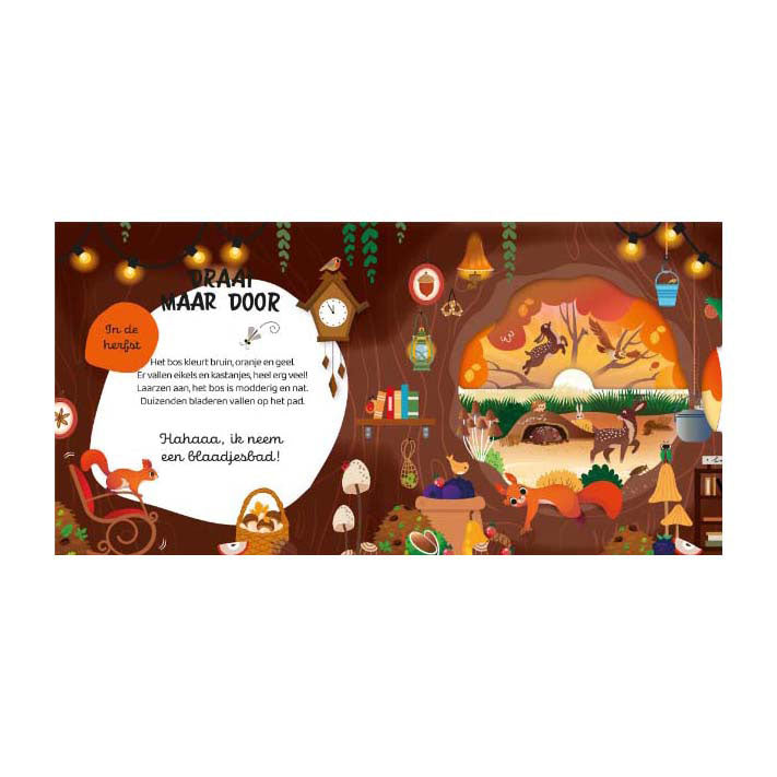 In het bos is van alles te beleven. Kun jij vertellen wat je allemaal ziet? Draai aan de schijf en zie hoe het bos elke keer weer anders. Voor kinderen vanaf 1 jaar oud.