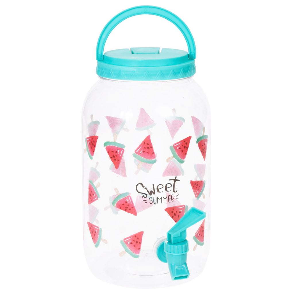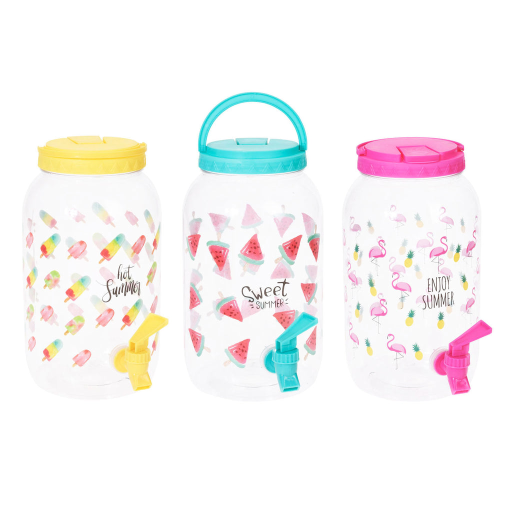 Deze zomerse limonadetap is gemaakt van kunststof en heeft een inhoud van 3,75 liter. De tap is verkrijgbaar in drie kleuren met een print van ijsjes, watermeloenen of flamingo's. De drankdispenser heeft een draaideksel en dankzij het handvat kun je de dispenser eenvoudig verplaatsen of meenemen.
