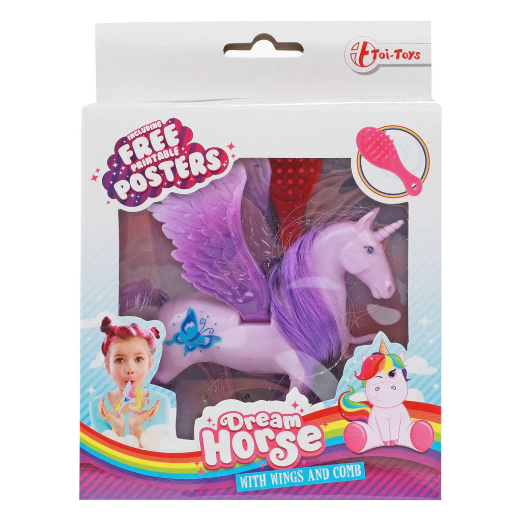 Is het een eenhoorn of een vliegend paard? Wat je ook vindt, deze kleine pegasus heeft sierlijke grote vleugels waarmee hij heerlijk door de lucht kan vliegen. Maar ojee, nu zijn de lange manen en staart helemaal door de war... Help jij hem weer mooi te worden? Pak snel de borstel die ook in dit lieve setje zit en kam alle haren tot ze mooi glanzen. De paardjes zijn in 3 verschillende kleuren verkrijgbaar. Oja, als je de QR-code op de verpakking scant kun je een leuke Dream Horse kleurplaat en vrolijke poster van de ondeugende Toi-Toys eenhoorn downloaden!
