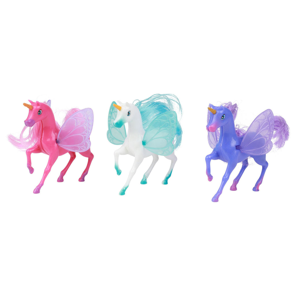 Set van 3 kleine plastic eenhoorns in een unikleur. De manen en staart zijn zacht, de doorzichtige vleugels zijn hard. Maar ze kunnen wel bewegen. Dus fladder snel naar een andere wereld.