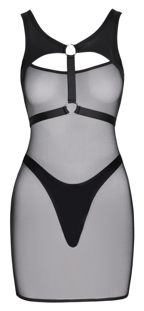 Geraffineerd zwart mini-jurkje van Cottelli PARTY gemaakt van fijn mesh. Het borsttuigje is vastgenaaid in een matte look met decoratieve zilverkleurige ringen. Overal zacht en elastisch voor een hoog draag- en bewegingscomfort. De extra hoog uitgesneden string in matte look is inbegrepen.