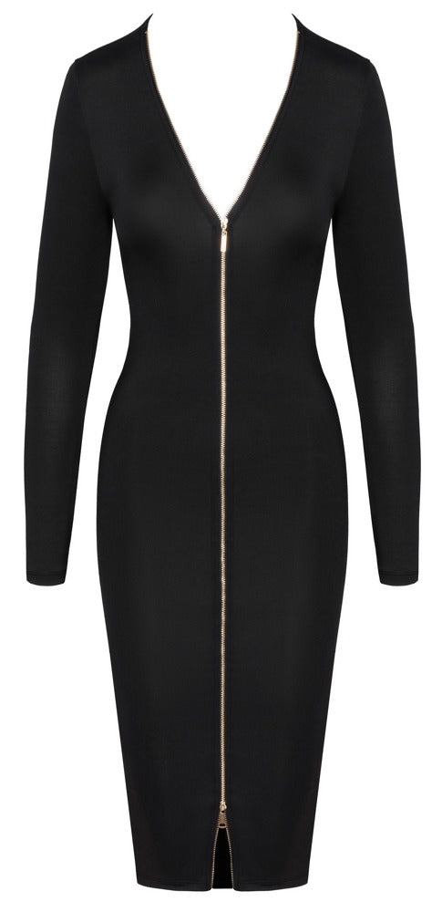 Zwarte jurk met lange mouwen van Cottelli PARTY in een nauwsluitend model en midi lengte. Met een goudkleurige 2-wegritssluiting aan de voorkant, die afzonderlijk van boven en onder kan worden geopend. Het fijne stretchmateriaal sluit nauw aan en zorgt voor het beste draag- en bewegingscomfort.