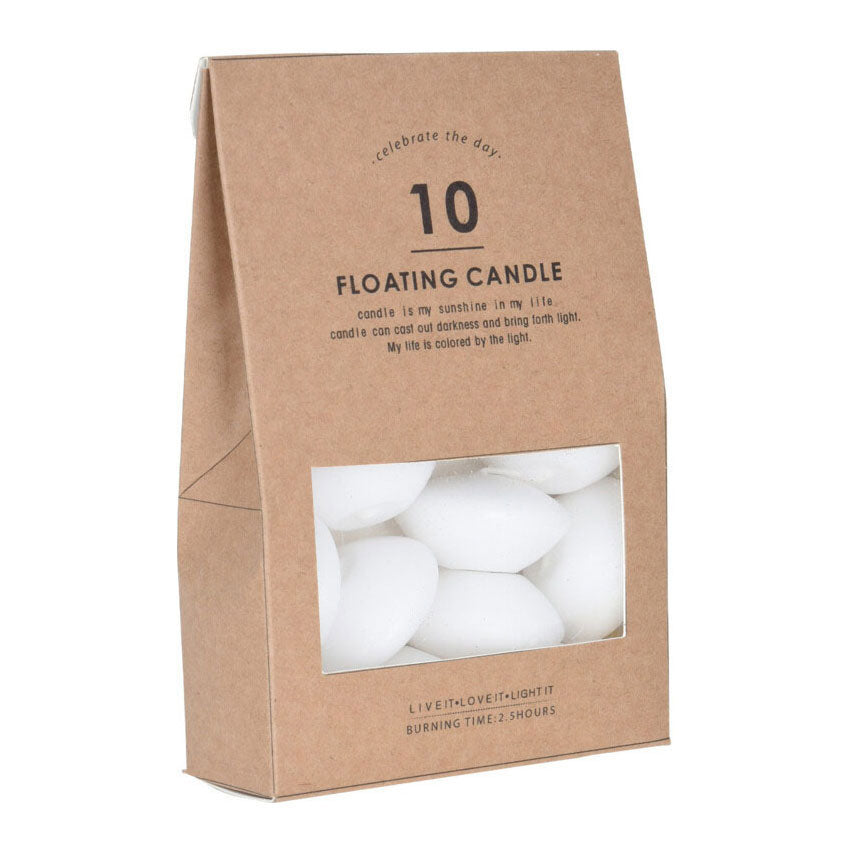 Zakje met 10 witte drijfkaarsen, 2 centimeter groot elk. Creëer een prachtig lichtschouwspel op het water! Brandtijd: 2 uur per kaars.