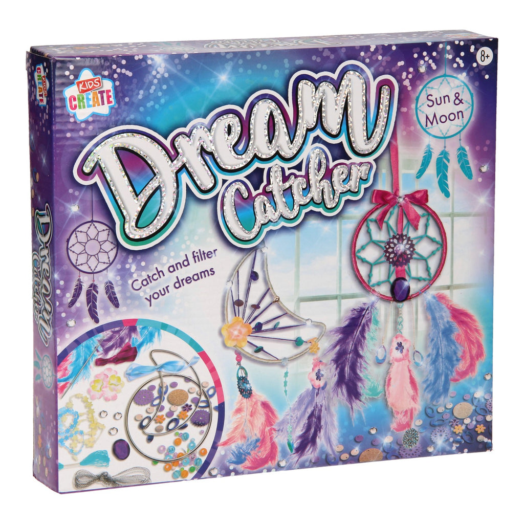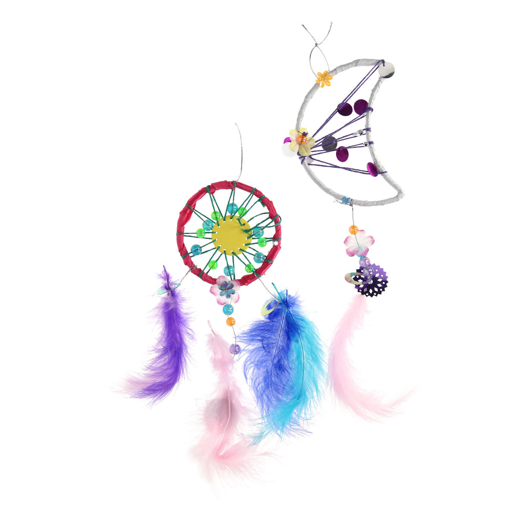 Nooit meer bang voor enge dromen! Met de Dromenvanger Set maak je 2 prachtige hangers die al je nare dromen verjagen. De set bestaat uit een grote ring, lint, kleurrijke veren, draad, ringetjes en parels. Het eindresultaat is 2 prachtige roze-blauw-paarse Dromenvangerd om de vorm van een zon en maan met een bloem en strik!