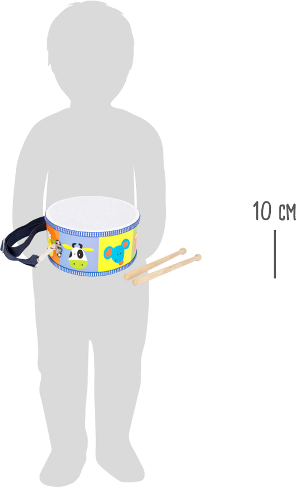 Deze kleurrijke trommel met schattige dierenkoppen nodigt uit tot vrolijke rellen in de kinderkamer! Met de drumsticks en hun schuimrubberen hoezen kan de drum worden gemaakt om een grote verscheidenheid aan geluiden te produceren. Inclusief verstelbare draagriem met twee karabijnhaken en twee drumstokken met schuimrubberen hoes. Dit is geen lawaai, dit is muziek en bewegingsplezier over de hele lijn! Hier kunnen kinderen hun motoriek trainen, stoom afblazen en hun interesse in muziek ontdekken!