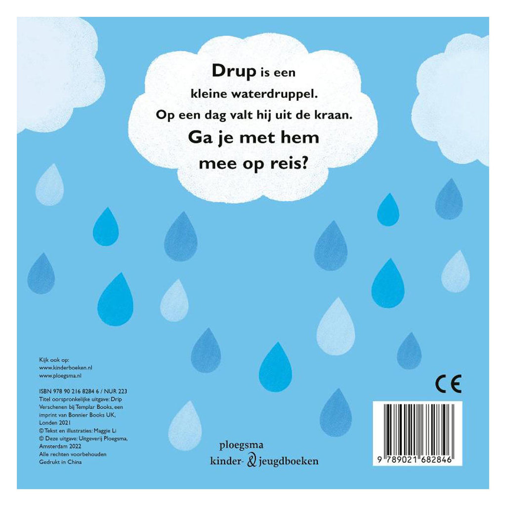 In dit kartonboek met stans volg je de weg van Drup van kraan naar riool en van rivier naar zee. Daar verandert hij in een wolk, waarna hij in de vorm van regen… weer een losse druppel wordt!