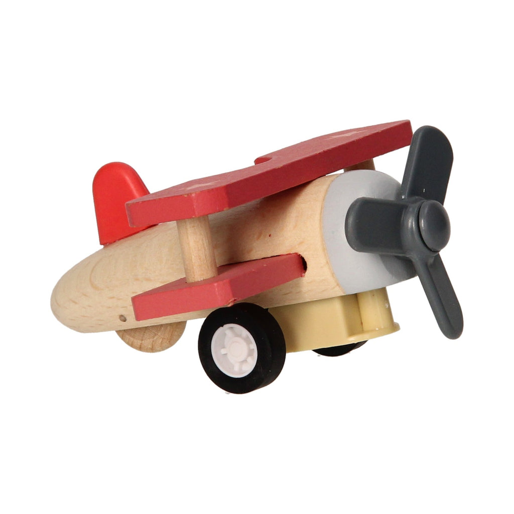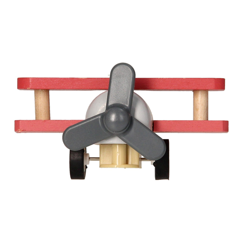 Houten dubbeldek vliegtuig met rode vleugels en een grijze propellor.
