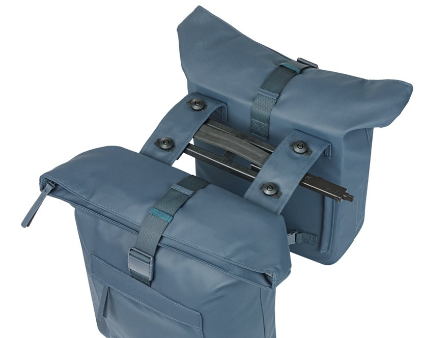 Van huis naar werk, in stijl De Basil Brooklyn dubbele fietstas is gemaakt voor forenzen en stadsfietsers die dagelijks onderweg zijn en daarbij veel willen meenemen, zonder in te leveren op stijl. Van een laptop en documenten tot boodschappen of sportkleding, deze dubbele tas biedt ruimte en overzicht. De navy-uitvoering oogt strak en professioneel en past bij elke moderne fiets. Design & stijl De tas heeft een cleane, ingetogen look met strakke lijnen en een stevige afwerking. Deze dubbele fietstas voelt zich net zo thuis in de stad als onderweg naar kantoor. Het ontwerp is modern en minimalistisch, met een zakelijke maar toegankelijke uitstraling. Gebruiksgemak & functionaliteit Met 41 liter inhoud is er ruimte genoeg voor al je dagelijkse benodigdheden. De tas is waterdicht en voorzien van een waterafstotende vouwsluiting met gesp. Voor kleinere items zijn er handige buitenvakken. Slim geplaatste klittenbandsluitingen zorgen voor stabiliteit op de fiets. De tas is daarnaast compatibel met de Basil Distance Holder voor extra veiligheid. Techniek & bevestiging Je bevestigt de Basil Brooklyn dubbele fietstas MIK eenvoudig dankzij de voorgemonteerde MIK-adapterplaat die voorzien is van een handige slotfunctie voor extra veiligheid. Wil je wisselen van fietsaccessoire, voor bijvoorbeeld een fietsmand, dan klik je je dubbele fietstas met gemak weer van de bagagedrager af. Heb je geen MIK bagagedrager op je (elektrische) fiets? Geen probleem! Monteer eenvoudig de MIK Carrierplate op je bagagedrager. Duurzaamheid & materiaalkeuze De Basil Brooklyn is gemaakt van gerecycled PET, volledig PFAS-vrij en waterdicht (IPX3). Dankzij de handige repairzipper is de tas eenvoudig te repareren, zodat je er nóg langer plezier van hebt. Kenmerken Inhoud: 41 liter Gemaakt van gerecycled PET (IPX3-waterdicht) PFAS-vrij materiaal Voorzien van voorgemonteerde MIK-adapterplaat Met slotfunctie voor extra veiligheid Eenvoudig afneembaar en uitwisselbaar met ander MIK-accessoire Compatibel met MIK bagagedragers en MIK Carrierplate Waterafstotende vouwsluiting met gesp Met buitenvakken voor kleine spullen Stabiele bevestiging met klittenband Geschikt voor gebruik met Basil Distance Holder (apart verkrijgbaar) Voorzien van repairzipper (voor eenvoudige reparatie) Afmetingen: 14 x 30 x 37 cm (D x B x H) Kleur: navy Ideaal voor woon-werkverkeer, boodschappen en dagelijks gebruik