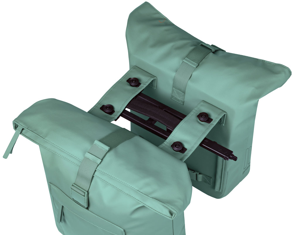Van huis naar werk, in stijl De Basil Brooklyn dubbele fietstas is gemaakt voor forenzen en stadsfietsers die dagelijks onderweg zijn en daarbij veel willen meenemen, zonder in te leveren op stijl. Van een laptop en documenten tot boodschappen of sportkleding, deze dubbele tas biedt ruimte en overzicht. De vergrijsde groentint geeft een frisse twist aan je ritten zonder in te boeten op professionaliteit. Design & stijl De tas heeft een cleane, ingetogen look met strakke lijnen en een stevige afwerking. Deze dubbele fietstas voelt zich net zo thuis in de stad als onderweg naar kantoor. Het ontwerp is modern en minimalistisch, met een zakelijke maar toegankelijke uitstraling. Gebruiksgemak & functionaliteit Met 41 liter inhoud is er ruimte genoeg voor al je dagelijkse benodigdheden. De tas is waterdicht en voorzien van een waterafstotende vouwsluiting met gesp. Voor kleinere items zijn er handige buitenvakken. Slim geplaatste klittenbandsluitingen zorgen voor stabiliteit op de fiets. De tas is daarnaast compatibel met de Basil Distance Holder voor extra veiligheid. Techniek & bevestiging Je bevestigt de Basil Brooklyn dubbele fietstas MIK eenvoudig dankzij de voorgemonteerde MIK-adapterplaat die voorzien is van een handige slotfunctie voor extra veiligheid. Wil je wisselen van fietsaccessoire, voor bijvoorbeeld een fietsmand, dan klik je je dubbele fietstas met gemak weer van de bagagedrager af. Heb je geen MIK bagagedrager op je (elektrische) fiets? Geen probleem! Monteer eenvoudig de MIK Carrierplate op je bagagedrager. Duurzaamheid & materiaalkeuze De Basil Brooklyn is gemaakt van gerecycled PET, volledig PFAS-vrij en waterdicht (IPX3). Dankzij de handige repairzipper is de tas eenvoudig te repareren, zodat je er nóg langer plezier van hebt. Kenmerken: Inhoud: 41 liter Kleur: Vergrijsd groen Materiaal: Gerecycled PET (PFAS-vrij) Bevestiging: MIK-systeem met voorgemonteerde adapterplaat Sluiting: Vouwsluiting met gesp (waterafstotend) Extra vakken: Buitenvakken voor kleinere items Waterdichtheid: IPX3 Reparatie: Voorzien van repairzipper Compatibiliteit: Geschikt voor Basil Distance Holder Gebruik: Ideaal voor woon-werkverkeer en stadsgebruik
