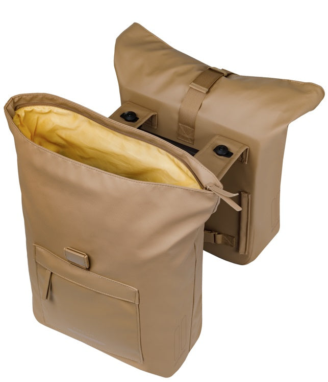 Van huis naar werk, in stijl De Basil Brooklyn dubbele fietstas is gemaakt voor forenzen en stadsfietsers die dagelijks onderweg zijn en daarbij veel willen meenemen, zonder in te leveren op stijl. Van een laptop en documenten tot boodschappen of sportkleding, deze dubbele tas biedt ruimte en overzicht. De zandkleurige uitvoering oogt professioneel en past moeiteloos bij elke fiets. Design & stijl De tas heeft een cleane, ingetogen look met strakke lijnen en een stevige afwerking. Deze dubbele fietstas voelt zich net zo thuis in de stad als onderweg naar kantoor. Het ontwerp is modern en minimalistisch, met een zakelijke maar toegankelijke uitstraling. Gebruiksgemak & functionaliteit Met 41 liter inhoud is er ruimte genoeg voor al je dagelijkse benodigdheden. De tas is waterdicht en voorzien van een waterafstotende vouwsluiting met gesp. Voor kleinere items zijn er handige buitenvakken. Slim geplaatste klittenbandsluitingen zorgen voor stabiliteit op de fiets. De tas is daarnaast compatibel met de Basil Distance Holder voor extra veiligheid. Techniek & bevestiging Je bevestigt de Basil Brooklyn dubbele fietstas MIK eenvoudig dankzij de voorgemonteerde MIK-adapterplaat die voorzien is van een handige slotfunctie voor extra veiligheid. Wil je wisselen van fietsaccessoire, voor bijvoorbeeld een fietsmand, dan klik je je dubbele fietstas met gemak weer van de bagagedrager af. Heb je geen MIK bagagedrager op je (elektrische) fiets? Geen probleem! Monteer eenvoudig de MIK Carrierplate op je bagagedrager. Duurzaamheid & materiaalkeuze De Basil Brooklyn is gemaakt van gerecycled PET, volledig PFAS-vrij en waterdicht (IPX3). Dankzij de handige repairzipper is de tas eenvoudig te repareren, zodat je er nóg langer plezier van hebt. Kenmerken Inhoud: 41 liter Gemaakt van gerecycled PET (IPX3-waterdicht) PFAS-vrij materiaal Voorzien van voorgemonteerde MIK-adapterplaat Met slotfunctie voor extra veiligheid Eenvoudig afneembaar en uitwisselbaar met ander MIK-accessoire Compatibel met MIK bagagedragers en MIK Carrierplate Waterafstotende vouwsluiting met gesp Met buitenvakken voor kleine spullen Stabiele bevestiging met klittenband Geschikt voor gebruik met Basil Distance Holder (apart verkrijgbaar) Voorzien van repairzipper (voor eenvoudige reparatie) Afmetingen: 14 x 30 x 37 cm (D x B x H) Kleur: zand Ideaal voor woon-werkverkeer, boodschappen en dagelijks gebruik