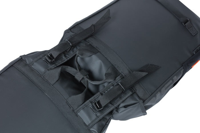 De Basil Miles Tarpaulin is een sportieve dubbele fietstas in het zwart. De tas heeft stoere oranje details. De fietstas is gemaakt van sterk matzwart Tarpaulin en heeft een inhoud van 34 liter. Aan de zijkanten van de tas bevinden zich nog twee extra elastische vakken. Handig voor het vervoeren van een flesje drinken of een regenjas. De tas is daarmee ideaal voor het maken van een korte of lange recreatieve fietstocht. Of voor een fietsvakantie! Mocht het plots gaan regenen, dan blijven je spullen droog. De tas is namelijk waterdicht en is voorzien van getapete naden en een roltopsluiting. De reflecterende details op de tas maken dat je beter zichtbaar bent voor andere verkeersdeelnemers. Daarnaast kun je extra LED-verlichting aan je tas hangen. De dubbele fietstas beschikt namelijk over verschillende lusjes voor LED-verlichting. Heb je veel en zwaardere spullen in je tas? Dan kun je de tas combineren met de Basil Afstandhouder (apart verkrijgbaar). Deze houder voorkomt dat de tas in de spaken van je fiets komt. Je bevestigt de Basil Miles dubbele fietstas eenvoudig op je bagagedrager met het Universal Bridge systeem. Dankzij het Universal Bridge systeem kun je kiezen uit hoe je de tas wilt bevestigen. Het bevestigen kan met de voorgemonteerde riempjes. Of in combinatie met het Basil DBS systeem (afneembare bagagedragerplaten) of een adapterplaat zoals MIK. Beide systemen dien je apart aan te schaffen. Eigenschappen: Met een inhoud van maar liefst 34 liter kun je veel kwijt in de Basil Miles dubbele fietstas. De extra reflecterende delen en de mogelijkheid om LED verlichting op deze tas aan te brengen maken fietsen in het donker veiliger. Makkelijk te bevestigen aan de bagagedrager van je (elektrische) fiets. Gemaakt van sterk en waterdicht Tarpaulin. Afmetingen: 34 cm x 16 cm x 43 cm (Buitenwerkse maten) Volume: 34 l Model: Achtertas Dubbel of enkel: Dubbel Volume (Ltr): 34,0 Geschikt voor: Elektrische fiets, stadfiets, city-trekking fiets