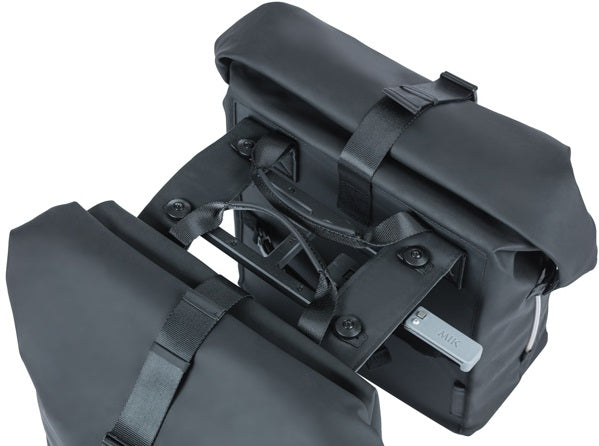 Ben je op zoek naar een ruime fietstas die er ook nog eens mooi uitziet? Dan is de Basil SoHo dubbele fietstas Nordlicht MIK in de pastelgroene kleur echt iets voor jou. Gemaakt van mat PU-materiaal dat erg zacht aanvoelt* met een inhoud van 41 liter. De tas is waterdicht (IPX3), waardoor jij jouw spullen altijd droog meeneemt. De tas sluit je af met een roltop die je aan de zijkanten van de tas met drukknopen bevestigt. Aan jouw veiligheid is ook gedacht. De tas is namelijk voorzien van Nordlicht Technology**, een geïntegreerde LED-strip. Zo val je in het donker beter op. De LED-verlichting werkt op 3x AAA batterijen (apart verkrijgbaar). Heb je veel en zwaardere spullen in je tas? Dan kun je de tas combineren met de Basil Afstandhouder (apart verkrijgbaar). Deze houder voorkomt dat de tas in de spaken van je fiets komt. Je bevestigt de tas eenvoudig dankzij de voorgemonteerde MIK-adapterplaat. Met deze adapterplaat klik je de fietstas eenvoudig in jouw bagagedrager met MIK-profielen of een MIK-bagagedragerplaat. Wil je de tas meenemen de winkel in? Dan klik je de mand er net zo gemakkelijk weer af. De MIK-adapterplaat past op veel bagagedragers, dames-, heren-, en de elektrische fiets. Eigenschappen: Waterdichte dubbele fietstas inclusief roltopsluiting. Voorzien van geïntegreerde LED-verlichting (batterijen apart verkrijgbaar). Ruime inhoud van 41 liter totaal. Inclusief voorgemonteerde MIK-adapterplaat en daardoor makkelijk te bevestigen. *Schuren tegen wat ruwere oppervlakten kan ervoor zorgen dat het materiaal beschadigt. De tas blijft ook dan waterdicht met dezelfde hoge IPX3 norm. ** Nordlicht Technology kun je gebruiken als een aanvullende verlichting en treedt op geen enkele wijze in de plaats van de wettelijk vereiste fietsverlichting. Voor het gebruik van alle verlichting dien je te allen tijde de wettelijke regels met betrekking tot fietsverlichting van het land op te volgen.