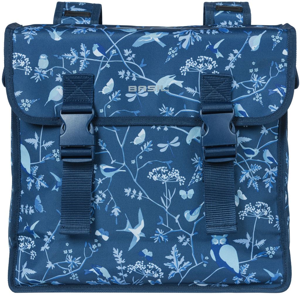 De Wanderlust fietstas is een blauwe dubbele fietstas met een kleurrijke vogelprint. Met deze trendy fietstas ga jij fluitend naar de supermarkt of op bezoek bij vrienden. Gaat het onderweg regenen? Dan zorgt het waterafstotende materiaal ervoor dat de inhoud van de tas droog blijft. Bovendien heeft de klep van de tas zijflappen waardoor inregenen wordt voorkomen. Met een inhoud van 35 liter heb je heel wat ruimte voor je boodschappen of andere dagelijkse benodigdheden. De tas is verkrijgbaar in een trendy indigoblauw kleur.    Je bevestigt de Basil Wanderlust dubbele fietstas eenvoudig op je bagagedrager met het Universal Bridge systeem. Dankzij het Universal Bridge systeem kun je kiezen uit hoe je de tas wilt bevestigen. Het bevestigen kan met de voorgemonteerde riempjes. Of in combinatie met het Basil DBS systeem (afneembare bagagedragerplaten) of een adapterplaat zoals MIK. Beide systemen dien je apart aan te schaffen.      Eigenschappen:  De reflecterende details zorgen voor extra zichtbaarheid in het donker.   Voorzien van reflecteren details voor een betere zichtbaarheid.    Makkelijk te bevestigen met het Universal Bridge systeem.    De fietstas is geschikt voor diverse bagagedragers (ook e-bikes).   Afmetingen: 36 cm x 14 cm x 41 cm (Buitenwerkse maten)   Volume: 35 l   Model: Achtertas   Dubbel of enkel: Dubbel   Volume (Ltr): 35,0