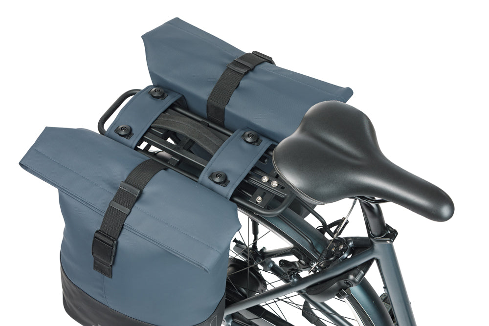 Tijdloze stijl voor dagelijks gebruik De Basil Cove dubbele fietstas is ontworpen voor wie elke dag onderweg is en zoekt naar een betrouwbare stijlvolle fietstas. Van boodschappen doen en woon-werkverkeer tot een dagje uit met het gezin. Deze dubbele tas beweegt moeiteloos met je dag mee. De ingetogen kleurencombinatie navy/black geeft je fiets een stoere klassieke uitstraling die past bij elke rit. Design & stijl Met zijn cleane lijnen, tweekleurig ontwerp en uniseks uitstraling sluit de Basil Cove perfect aan bij het actieve stedelijke leven. De tas oogt strak zonder overdaad en straalt tegelijkertijd degelijkheid en stijl uit. Een echte allrounder voor iedereen die houdt van een functionele én fraaie tas. Gebruiksgemak & functionaliteit De tas biedt een inhoud van 28 tot 32 liter verdeeld over twee ruime hoofdvakken. Dankzij de waterafstotende vouwsluiting met gesp blijven je spullen goed beschermd. Slim geplaatste klittenbandsluitingen zorgen voor stabiliteit tijdens het fietsen. De tas is ook compatibel met de Basil Distance Holder voor extra veiligheid. Techniek & bevestiging Je bevestigt de Basil Cove dubbele fietstas MIK eenvoudig dankzij de voorgemonteerde MIK-adapterplaat die voorzien is van een handige slotfunctie voor extra veiligheid. Wil je wisselen van fietsaccessoire, voor bijvoorbeeld een fietsmand, dan klik je je dubbele fietstas met gemak weer van de bagagedrager af. Heb je geen MIK bagagedrager op je (elektrische) fiets? Geen probleem! Monteer eenvoudig de MIK Carrierplate op je bagagedrager. Duurzaamheid & materiaalkeuze De Basil Cove is gemaakt van gerecycled PET met vegan leer en is volledig PFAS-vrij. Het materiaal is waterafstotend, sterk en duurzaam. Klaar voor intensief dagelijks gebruik. Kenmerken: Inhoud: 28 32 liter Twee ruime hoofdvakken met vouwsluiting en gesp Klittenbandsluitingen voor extra stabiliteit tijdens het fietsen Inclusief voorgemonteerde MIK-adapterplaat Slotfunctie op de adapter voor extra beveiliging Snel wisselen van accessoire dankzij het MIK-systeem Compatibel met MIK Carrierplate voor fietsen zonder MIK-bagagedrager Gemaakt van gerecycled PET met vegan leren details Volledig PFAS-vrij en waterafstotend Duurzaam en geschikt voor dagelijks gebruik