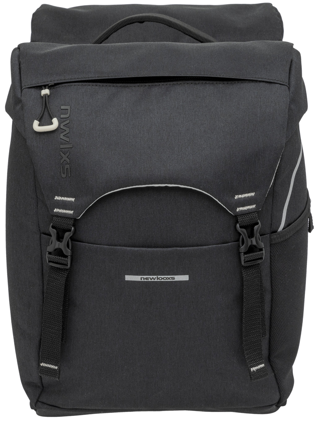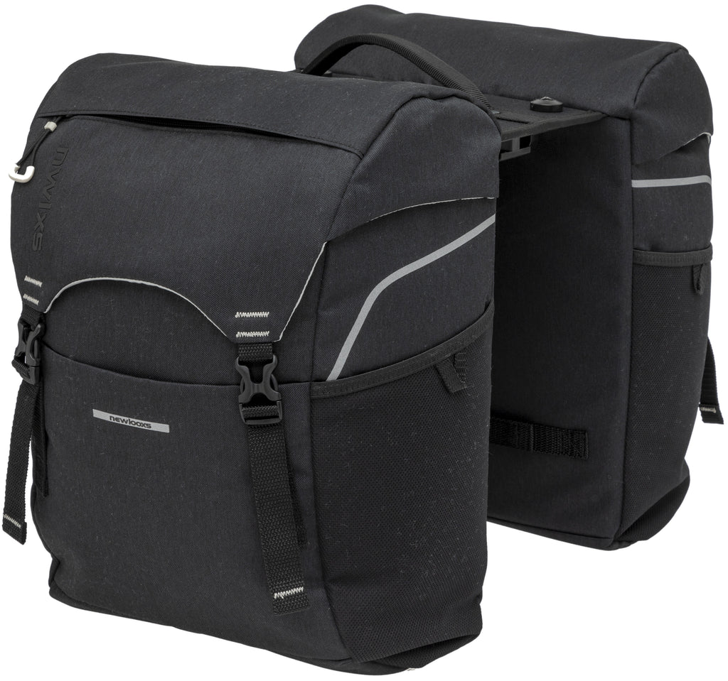De Sports Double MIK is een sportieve dubbele fietstas, gemaakt van waterafstotend polyester. Deze tas is geschikt voor MIK bagagedragers. De bijbehorende regenhoes beschermt jouw spullen tegen een flinke regenbui. De tas heeft een handzaam formaat. Naast de ruime hoofdvakken beschikt hij over veel handige extra vakjes. Dit maakt deze fietstas geschikt om boodschappen mee te doen, naar werk te fietsen of gewoon een recreatief ritje te maken. De tas is stevig en vormvast door de kunststof platen in de bodem en achterwand en de extra versteviging door middel van foam. Zo blijft deze sportieve tas goed in vorm en stop je er makkelijk je spullen in. De tas is afgewerkt met reflectie voor extra veiligheid in het donker. Sportieve dubbele fietstas gemaakt van waterafstotend Polyester Inclusief regenhoes Reflectie aan 3 zijden Met kliksluiting Hoofdvak met 6 kleinere vakken Inclusief voorgemonteerde MIK Adapter Bevestig met een klik, neem in één handbeweging af Productspecificaties: Materiaal: Polyester Groep: Fietstas Type: Dubbele tas Plaats op fiets: Bagagedrager Waterbestendig: Waterdicht Inhoud: 32 liter Gewicht: 1,50 kg Afmeting: 29cm x 16cm x 39cm (2x) Bevestiging: MIK adapter Kleur: zwart