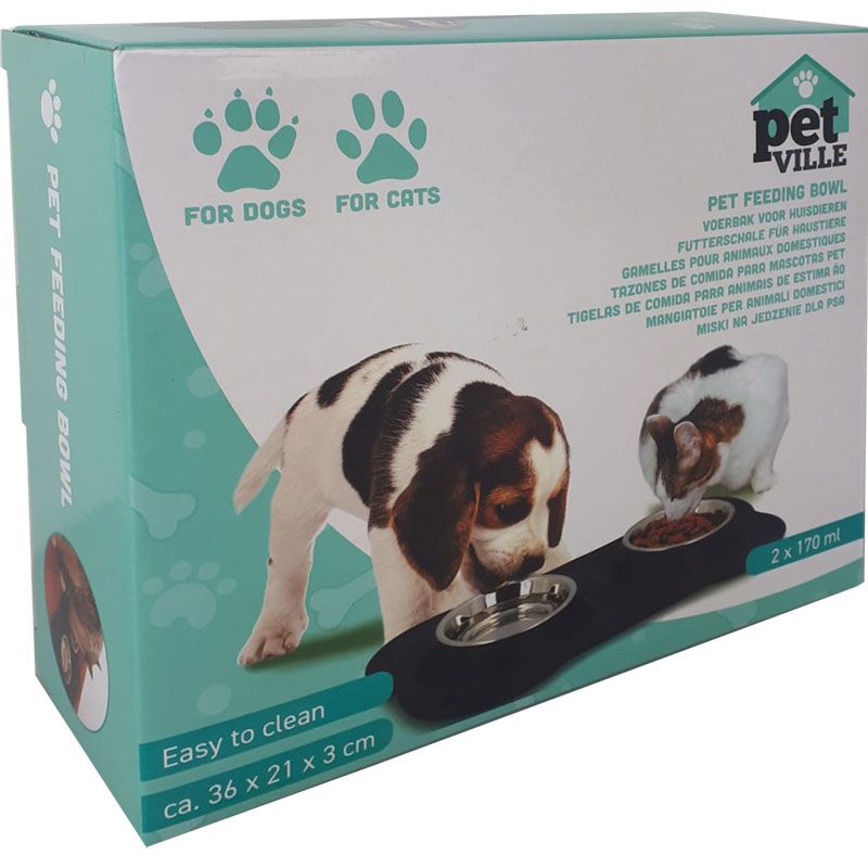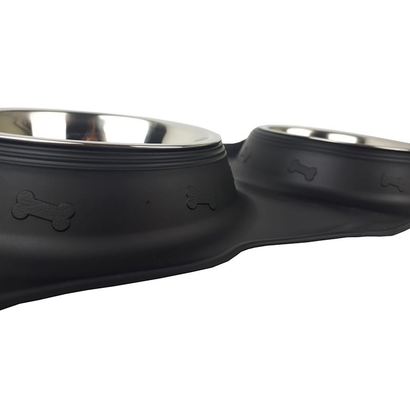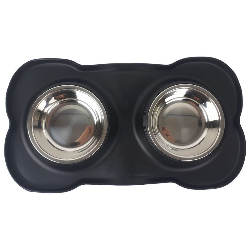 - dankzij de rubberen mat met openstaande rand, verschuiven de bakken niet en blijft geknoeid voedsel netjes op de mat liggen