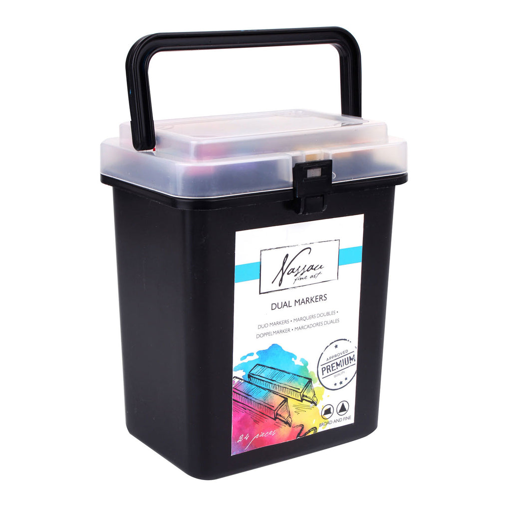 Emmer met 24 dubbelzijdige Nassau Fine Art viltstiften. De dunne kant van de stift heeft is 1-2 mm dik en de brede kant van de stift is 6 mm dik.