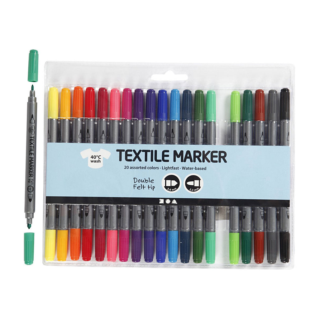 Goede kwaliteit, sterke, permanente textielstiften met dubbele punt. Na fixatie wasbaar op 40°C. Pak met 20 kleuren. Lijndikte: 2,3 + 3,6 mm.