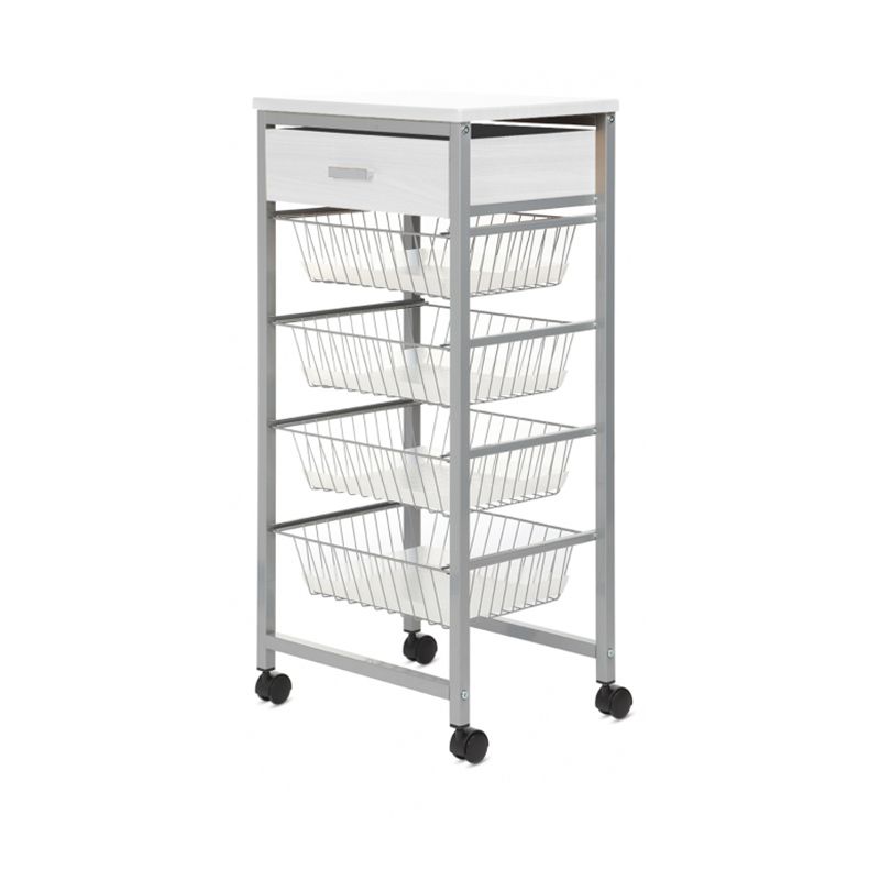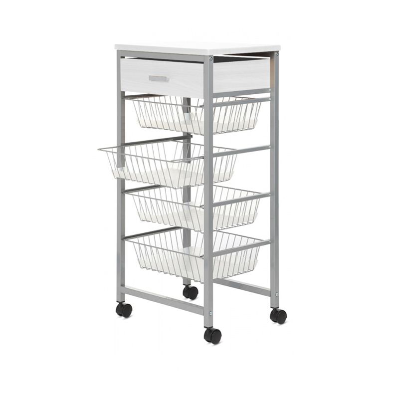 Wil je iets opbergen in je keuken, maar zitten de kastjes allemaal vol? Deze verrijdbare trolley is de oplossing. De 4 uitschuifbare metalen manden bieden ruimte voor het opbergen van diverse spullen, zoals handdoeken en theedoeken, kruidenpotjes of groente en fruit. Daarnaast beschikt deze trolley over een extra lade onder het werkblad. Deze kan gebruikt worden voor bijvoorbeeld het opbergen van messen of ander keukengerei. Het houten werkblad biedt ruimte om de trolley als werkruimte te gebruiken, maar kan ook gebruikt worden als extra plaats om spullen neer te zetten. De trolley staat erg stijlvol in de keuken, maar kan ook een praktische oplossing bieden in andere kamers, zoals de badkamer. Tevens is de trolley te gebruiken als serveerwagen.
