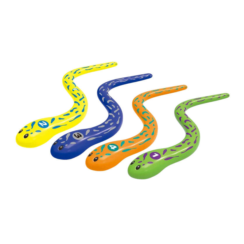 Set van 4 duikslangen in de kleuren groen, geel, blauw en oranje. Geschikt vanaf 6 jaar.