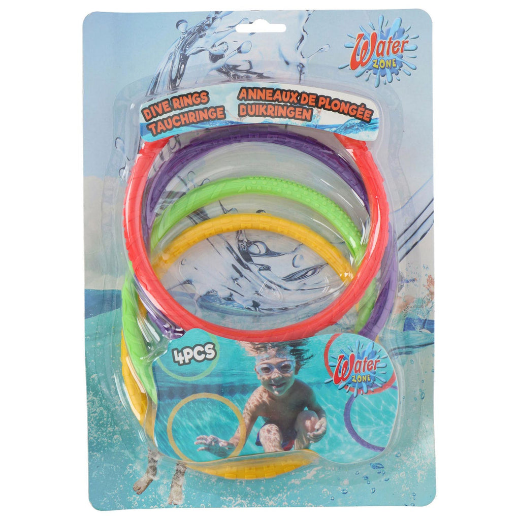 4 stuks duikringen in verschillende kleuren. Gemaakt van kunststof, doorsnede van 15 cm.