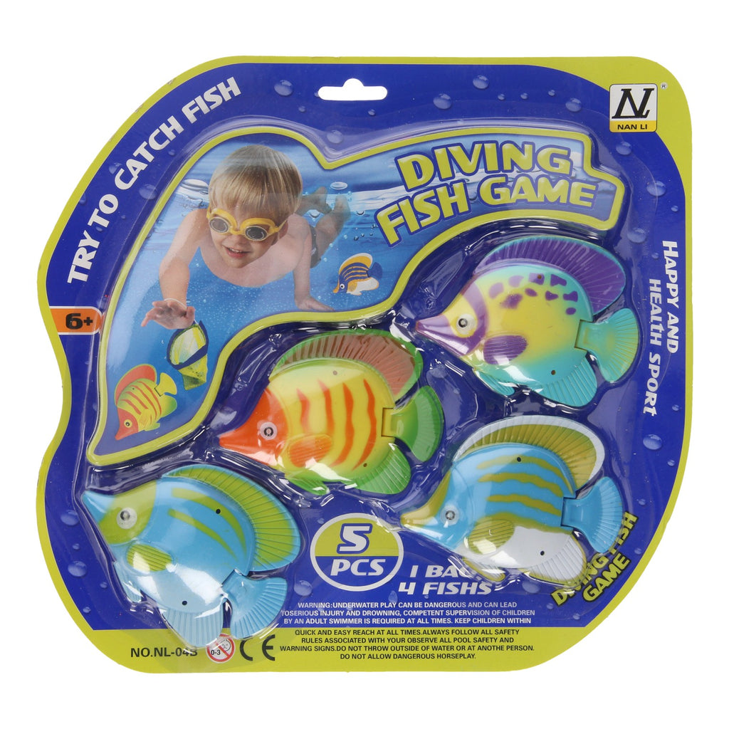 Set bestaat uit 4 visjes in vrolijke, felle kleuren en een handig netje om ze in te bewaren.