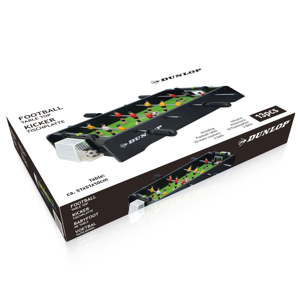 Mini tafelvoetbalspel, 22 spelers, 2 ballen en 2 scoretellers. Afmetingen: 46,5 bij 31,3 bij 9 centimeter.