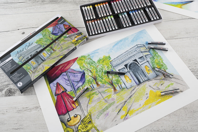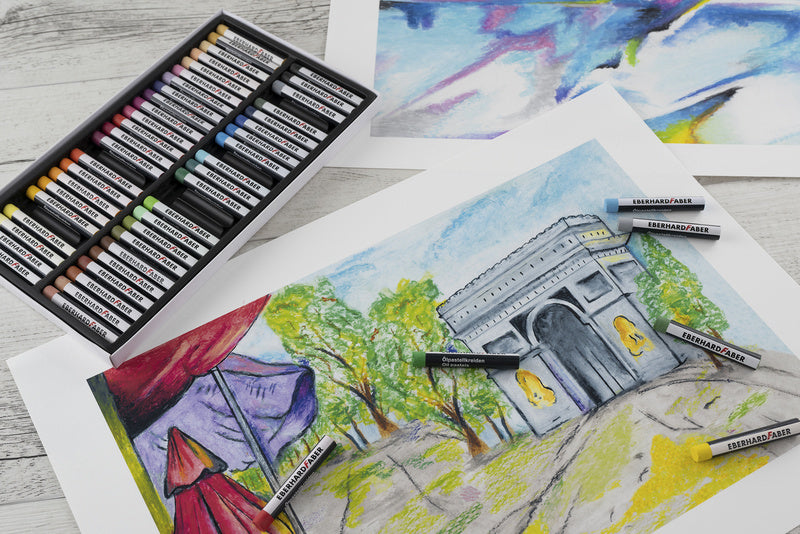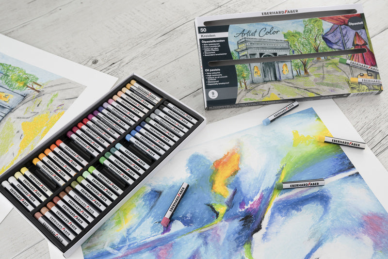 Oliepastelkrijt, zeer intensieve kleuren en te gebruiken op alle gladde oppervlakken, watervast, breukvast en het krijt is met papier omwikkelt. Krijt van Ø 9 mm, en 70 mm lang. Verpakt in kartonnen etui. 50 stuks.