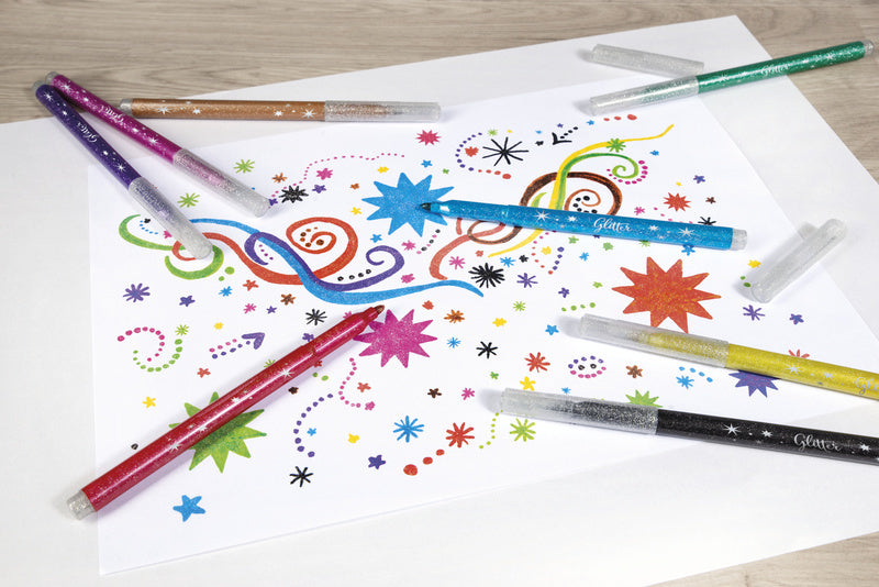 Glitter viltstiften met een fijne punt en een geventileerde dop. Uitwasbaar uit de meeste textielsoorten. De viltstiften zijn ideaal voor glinsterende hoogtepunten in de kleine kunstwerken. Geleverd in 8 verschillende kleuren.