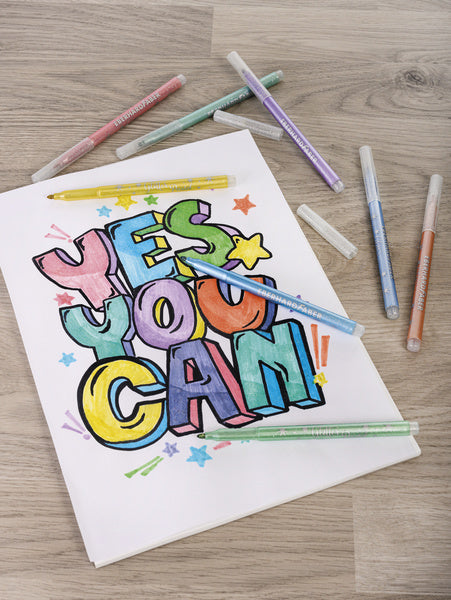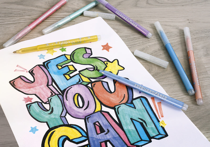 Glitter viltstiften met een fijne punt en een geventileerde dop. uitwasbaar uit de meeste textielsoorten. de viltstiften zijn ideaal voor glinsterende hoogtepunten in de kleine kunstwerken. In 8 verschillende pastel kleuren.