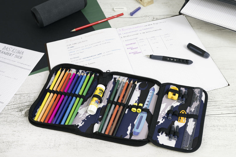 Etui 32-delig gevuld. Uitvoering Camouflage design grijs. Inhoud: 17 kleurpotloden, 1 grafietpotlood, 1 puntenslijper, 1 gum, 4 inktpatronen, 1 driehoek, 1 liniaal van 16 cm, 1 lijmstift, 1 potloodverlenger, 1 vulpen, 1 rooster, 2 paperclips. Materiaal etui: Polyester. Verkrijgbaar in verschillende designs.