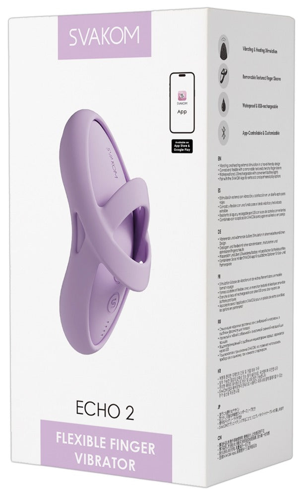 De kleine, lichtgewicht Echo 2 flexibele vingervibrator van SVAKOM is perfect voor het stimuleren van externe plezierzones tijdens het spelen alleen of met z'n tweeën. De rekbare siliconen lussen kunnen moeiteloos over de vinger worden geschoven, waardoor het ergonomisch gebogen kussentje perfect past. Hierdoor is het gemakkelijk te leiden en te gebruiken. Zijdezachte silicone en zachte groeven flatteren de huid en erogene punten. De siliconen vingermouw kan ook worden verwijderd om de Echo 2 te gebruiken als een gladde lay-on vibrator.