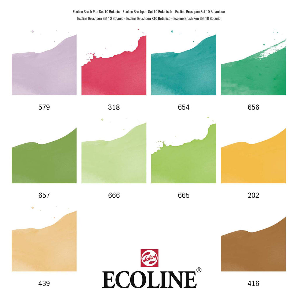 Deze set bevat 10 Ecoline Brush Pens in levendige botanische tinten. De Brush Pen kenmerkt zich door de flexibele punt en het uitgebreide assortiment schitterende kleuren dankzij de pure formule op kleurstofbasis. De transparante kleuren bieden de beste resultaten bij gebruik op wit of zeer lichtgekleurd papier. Indien gewenst kun je de kleurintensiteit gemakkelijk verminderen door ze te verdunnen met water of met de Brush Pen blender (apart verkrijgbaar). Deze pennen zijn perfect voor handlettering, aquareltekeningen, snelle schetsen en finishing touches.