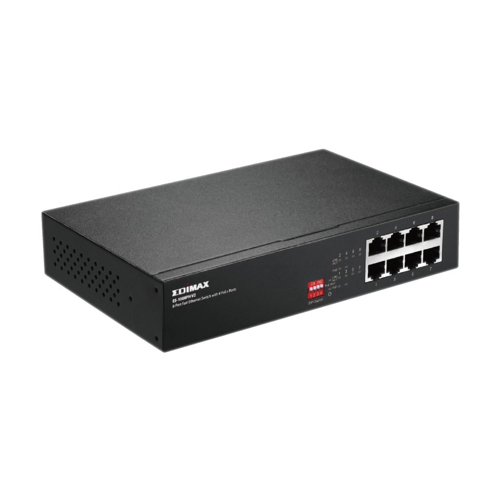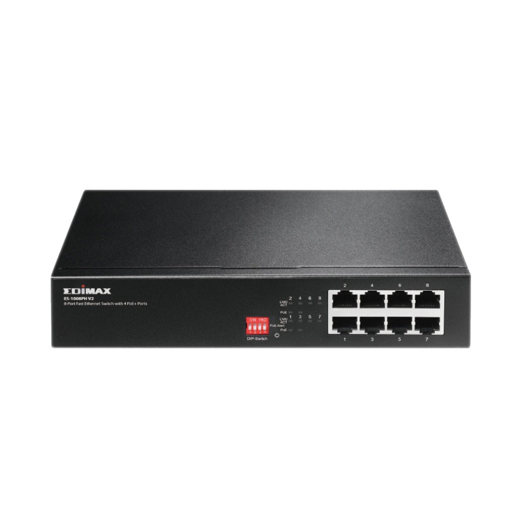 The Edimax ES-1008PH V2 is an eight port Fast Ethernet switch with four PoE+ Ports designed for use in home, small or medium sized network environments. With four DIP switches, PoE ports can be manually set with on/off control, extending PoE delivery distance up to 200 meters and port-based on/off control for VLAN and QoS is also supported. The switch easily connects and supplies power to PoE-enabled devices such as wireless access points, network cameras and IP phones as well as other Ethernet-enabled devices such as computers, printers or network attached storage (NAS). The compact size and fan-less design make the switch an ideal solution for expanding home and small business networks.