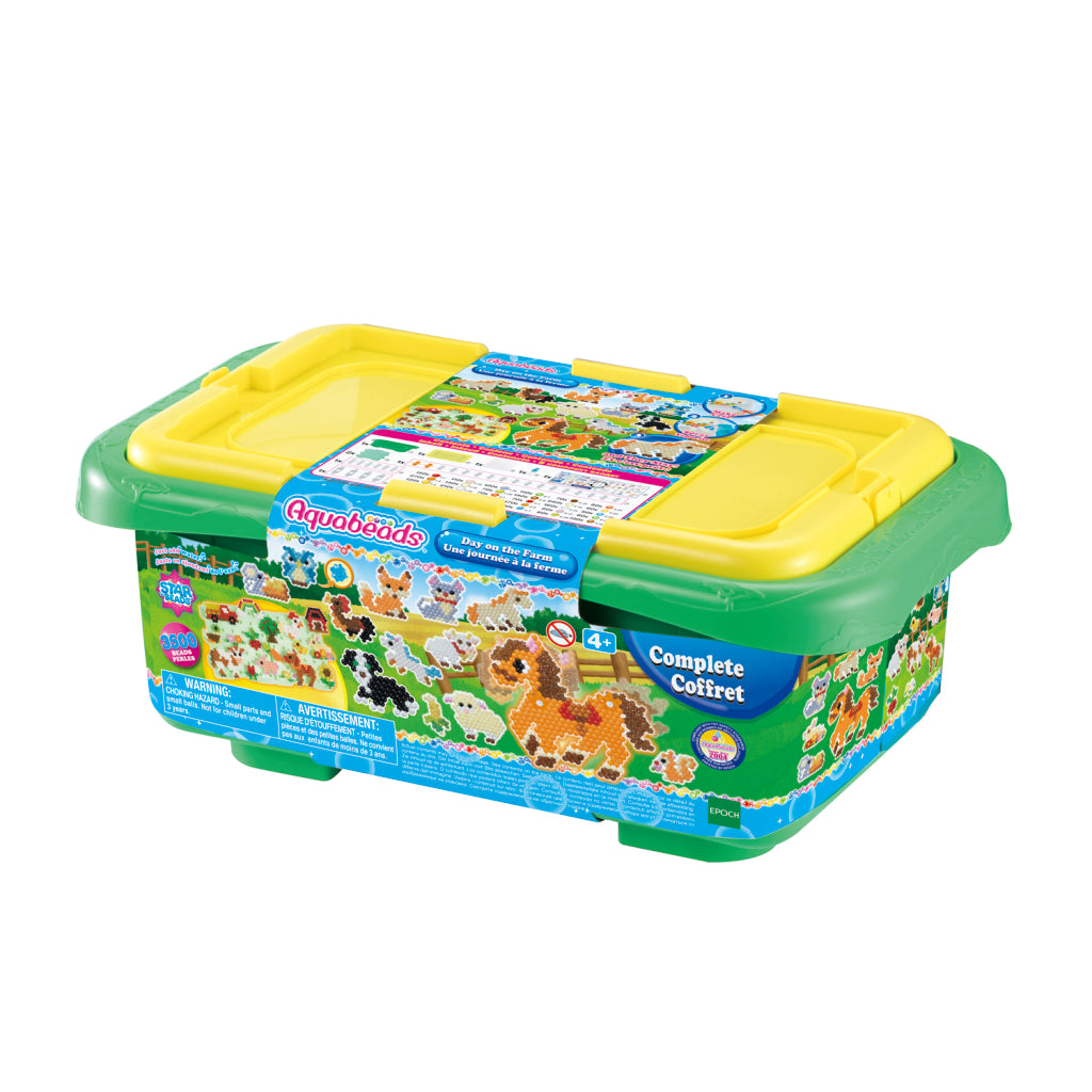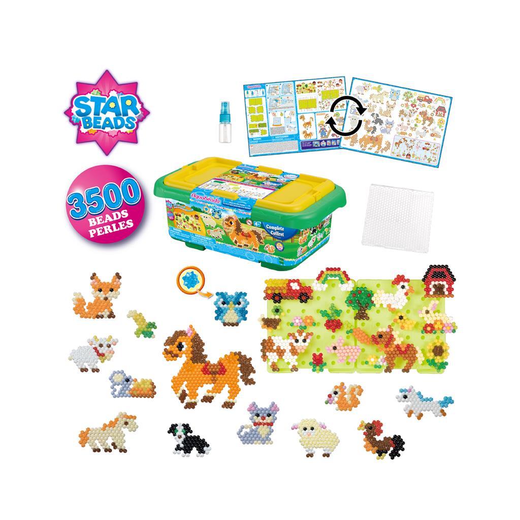 Ga lekkercreatief aan de slagmet Aquabeads Dag op de boerderij box ,Het originele "plakken met water" knutselproduct. De Dag op de Boerderij box bevat meer dan 3500 sterren, effen ,en juweelparels in 35 kleuren, 2 creatie borden , design pinnen, legbord , sproeier, patroonvellen en een handleiding. Maak creaties van het boerderij thema, zoals paarden, herdershond, schaap, koe, en een varken. Geschikt voor kinderen van 4 jaar en ouder.