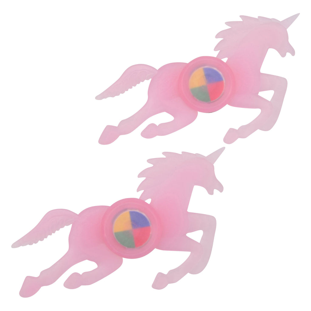 Spaakverlichting in unicornvorm voor op de fiets. Inhoud: 2x ledlichten voor betere zichtbaarheid in het donker én een cool kleureffect. Batterijen inbegrepen. Afmetingen: 16 x 2 x 26 cm. Geschikt vanaf 5 jaar.