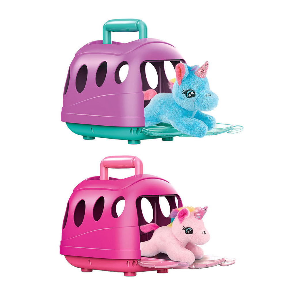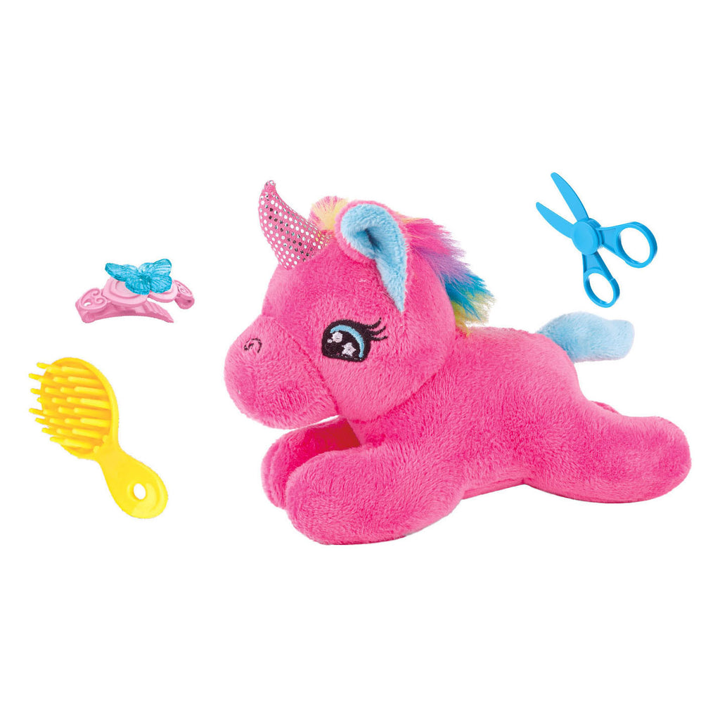 Pluche eenhoorn knuffel in een reiskoffer. Inclusief accessoires: borstel, haarklip en schaar. Afmetingen reiskoffer: 17 bij 13,5 bij 15 cm. Geschikt voor kinderen vanaf 3 jaar oud.