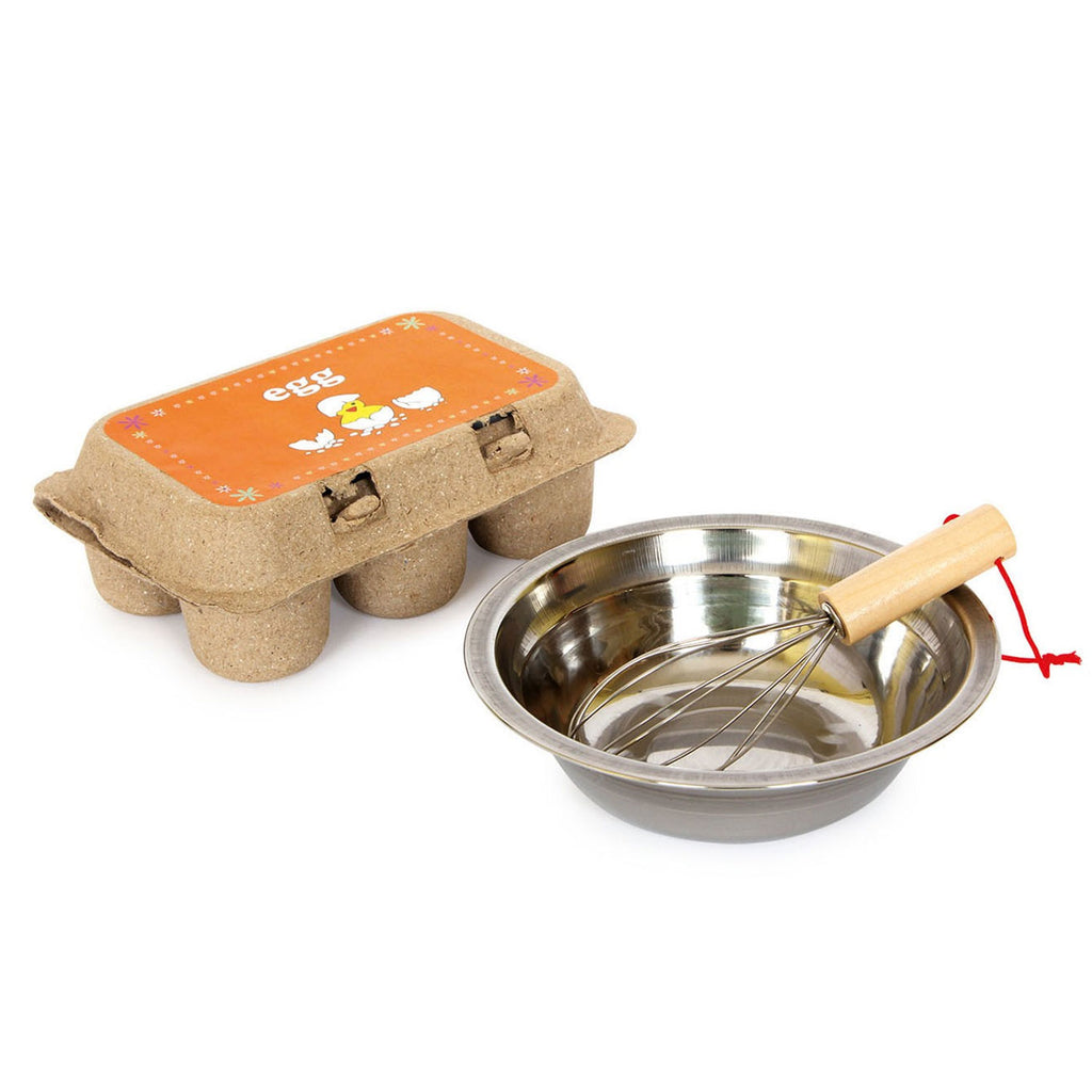Bereid een lekker geklutst eitje met deze set speeleten. Tik het ei op de rand van de kom open, laat de houten dooier in de kom vallen en kloppen maar! In de set vind je een kartonnen eierdoosje met 6 houten eieren, een metalen kom en een garde.