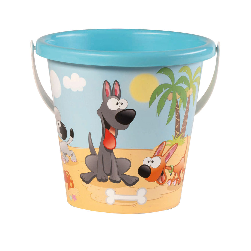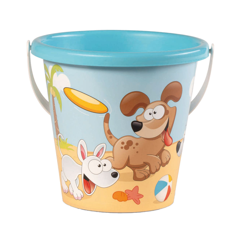 Emmertje voor het strand of zandbak, met afbeeldingen van honden. De emmer heeft een diameter van 16 cm. Geschikt voor kinderen vanaf 1 jaar.