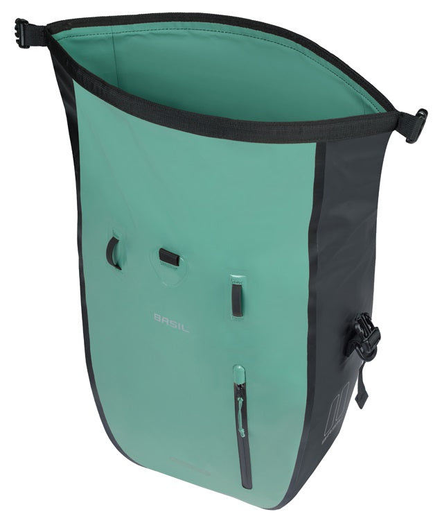 Meer ruimte voor al je avonturen De Basil Rivo L is dé fietstas voor fietsers die meer meenemen of langer onderweg zijn. Dankzij het slimme ontwerp met extra inhoud is deze tas perfect voor woon-werkverkeer, bikepacking of een stevige dagtocht. De combinatie van silvergreen met zwart geeft de tas een sportieve, frisse uitstraling. Design & stijl Gemaakt van stevig tarpaulin en voorzien van een strakke afwerking is deze tas zowel functioneel als visueel krachtig. De contrastvoering aan de binnenzijde helpt je snel alles terug te vinden. De cleane vormgeving en sportieve details maken het een allrounder voor dagelijks én recreatief gebruik. Gebruiksgemak & functionaliteit De tas heeft een royale inhoud van 25 tot 31 liter. Je sluit het hoofdvak met een stevige rolltop en zijgespen. Binnenin zitten twee mesh vakken, aan de buitenkant een extra ritsvak. Dankzij de afneembare schouderband neem je de tas ook makkelijk mee als je afstapt. Met reflectie en helmbevestigingslussen ben je altijd goed zichtbaar én voorbereid. Techniek & bevestiging Met MIK Hooks klik je de fietstas met één handbeweging stevig vast op je bagagedrager en net zo makkelijk weer los. Ideaal voor wie sportief en flexibel onderweg wil zijn. Duurzaamheid & materiaalkeuze De Basil Rivo is gemaakt van robuust, waterdicht tarpaulin (IPX3) en volledig PFAS-vrij. Een duurzame keus voor veeleisende fietsers. Kenmerken Inhoud: 25 31 liter Gemaakt van waterdicht tarpaulin (IPX3) PFAS-vrij materiaal Rolltop-sluiting met zijgespen 2 mesh binnenvakken en een buitenvak met rits Inclusief afneembare schouderband Voorzien van helmbevestiging en reflecterende details Bevestiging met MIK Hooks (geschikt voor MIK-systeemdragers) Afmetingen: 14 x 28 x 43 cm (D x B x H) Kleur: silvergreen/zwart Ideaal voor woon-werkverkeer, bikepacking of lange dagtochten