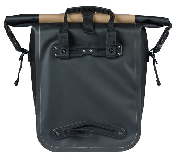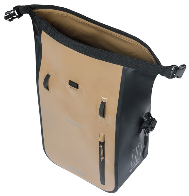 Actief op pad met comfort en stijl De Basil Rivo M enkele fietstas is speciaal ontwikkeld voor sportieve en recreatieve fietsers. Of je nu op avontuur gaat in de natuur of de stad doorkruist, deze compacte enkele tas biedt alles wat je nodig hebt. De combinatie van zandkleur met zwarte accenten geeft een zachte, natuurlijke look die mooi contrasteert met het robuuste ontwerp. Design & stijl De tas is gemaakt van sterk, waterdicht tarpaulin en heeft een cleane vormgeving met contrasterende binnenkant. Het formaat is ideaal voor wie licht wil reizen maar toch alles georganiseerd mee wil nemen. De stijl is sportief, functioneel en no-nonsense. Gebruiksgemak & functionaliteit Met een inhoud van 12 tot 15 liter biedt de tas ruimte voor persoonlijke spullen, snacks of een regenjack. Mesh opbergvakken binnenin, een ritsvak buiten en een afneembare schouderband zorgen voor gemak onderweg. Helmbevestigingslussen en reflectie zorgen voor extra veiligheid tijdens je ritten. Techniek & bevestiging Met MIK Hooks klik je de fietstas met één handbeweging stevig vast op je bagagedrager en net zo makkelijk weer los. Ideaal voor wie sportief en flexibel onderweg wil zijn. Duurzaamheid & materiaalkeuze Gemaakt van tarpaulin en volledig PFAS-vrij. De tas is IPX3-waterdicht en ontworpen voor intensieve ritten in weer en wind. Kenmerken Inhoud: 12 15 liter Gemaakt van waterdicht tarpaulin (IPX3) PFAS-vrij materiaal Inclusief afneembare schouderband Binnenvakken van mesh en een buitenvak met rits Voorzien van helmbevestiging en reflecterende details Bevestiging met MIK Hooks (geschikt voor MIK-systeemdragers) Afmetingen: 14 x 25 x 38 cm (D x B x H) Kleur: zand/zwartI deaal voor sportieve én dagelijkse ritten